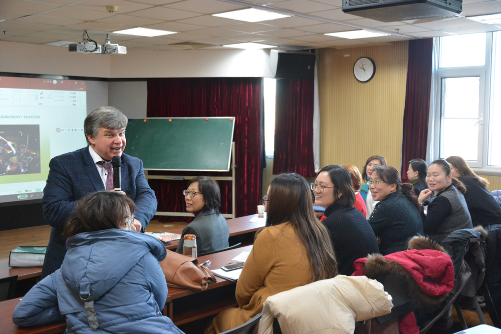 次日,俄语教师联合发展中心主任刘娟教授就高中俄语新课标改革以及目前中学俄语教学存在的系列问题与各位老师们进行了深入探讨。随后,人民教育出版社俄语室主任田旭老师及俄罗斯专家阿廖娜·尼(А.В.Ни)为各位中学教师们介绍了新版俄语高中教材的特色及编排理念。下午,北师大俄文系吴素娟副教授为老师们开展了俄语视听说教学方法的讲座,北师大穆新华副教授从教学理念到具体操练针对中学俄语教师开展了关于外语学习方法的讲座。