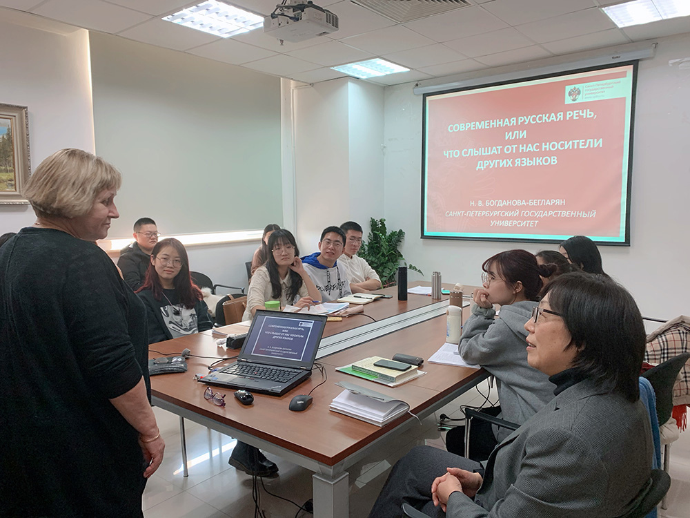 讲座开始,波格丹诺娃-别格拉里扬教授提出:在学习俄语的过程中,不仅要学习规范、标准的俄语,也要理解那些在俄语口语中的“违规现象”。为论证这一观点,波格丹诺娃-别格拉里扬教授向大家介绍了由她主持,名为“Один речевой день”的声音语料库研究,该项研究通过记录俄罗斯人的日常对话(超过1250个小时的音频采集和130名研究对象),提炼出俄罗斯人在口语中最常使用,但不符合语言规范的表达。她分为不同类别,用文字搭配音频,生动地为大家展示了一系列俄语口语中不符合使用规范的实例。她用大家最熟悉的“здравствуйте”、“говорить”等词语为例,展示了在口语中这些词汇不符合规范的用法。现场的老师和同学们无不被波格丹诺娃-别格拉里扬教授详实的数据和全面的分析深深吸引。