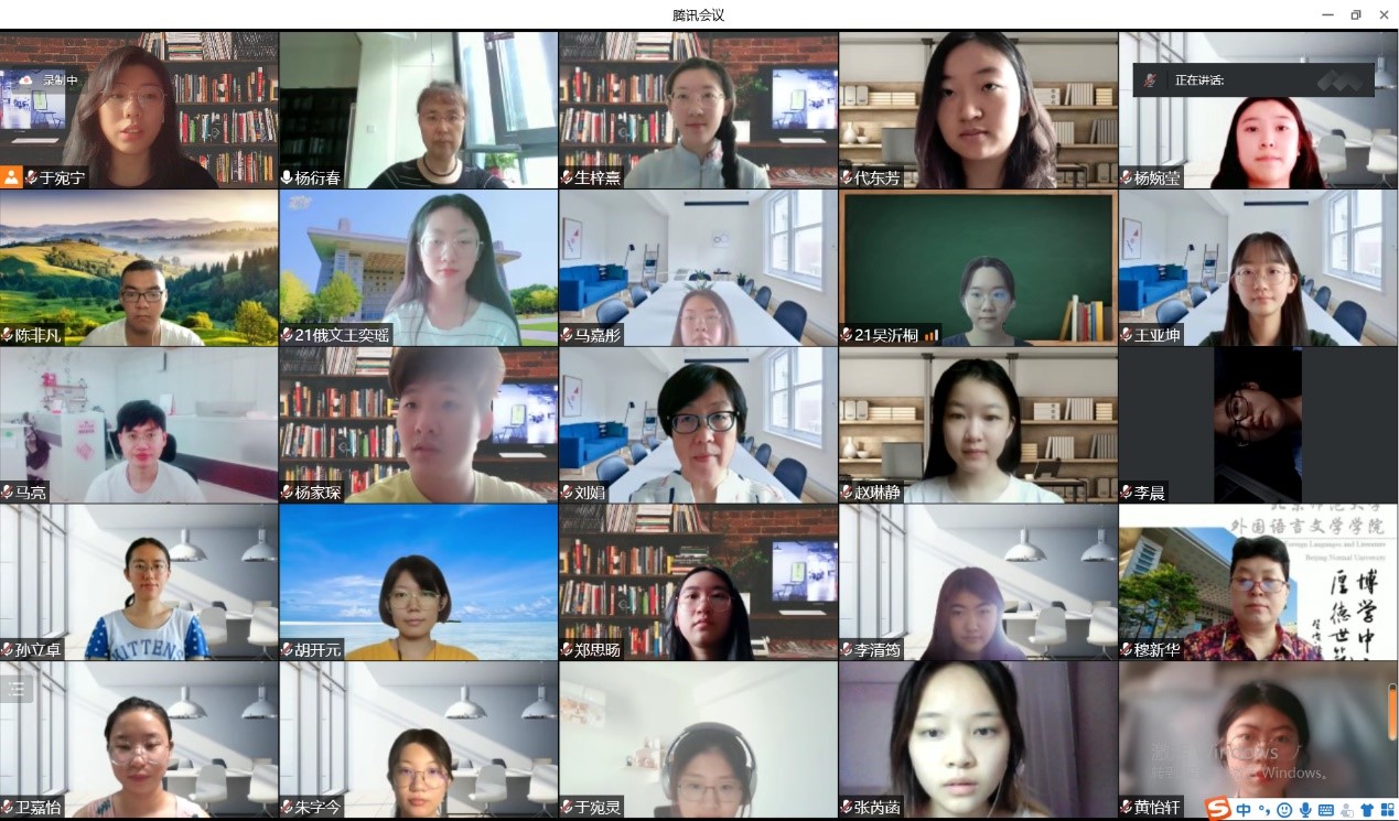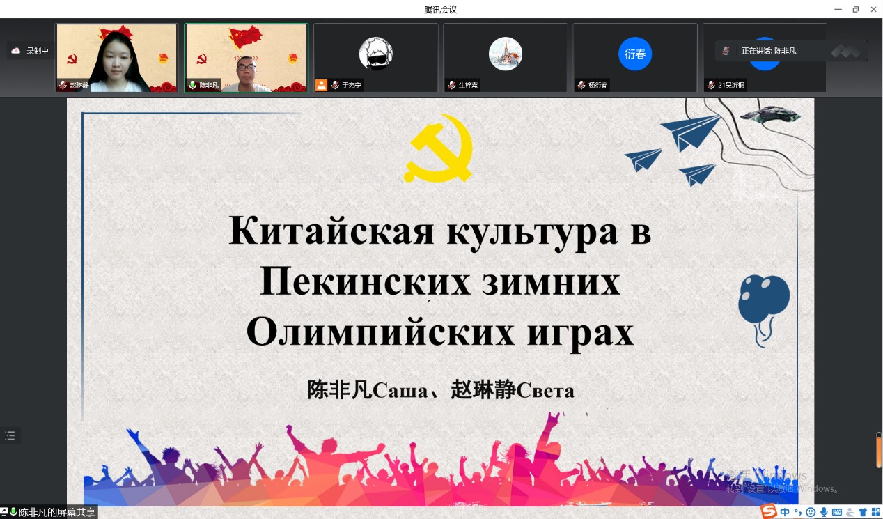 2020级本科的陈非凡、赵琳静、曾小桐、杨国林、李嘉泽、胡开元6位同学从冬奥、疫情的大背景和非遗、节日、饮食的中国文化出发,展现了中华民族的一系列高光时刻。马亮老师和穆新华老师对展示同学的俄语水平进步给予肯定,鼓励同学们继续对问题的深刻的思考。