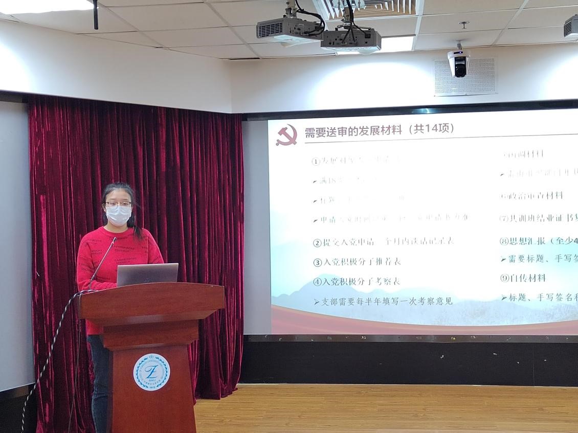 田紫玲同学首先介绍了支部发展会前需要提交的材料,包括发展对象入党申请书、提交入党申请一个月内谈话记录表、入党积极分子推荐表、入党积极分子考察表、函调材料、政治审查材料、共训班结业证书复印件等共14项材料。
