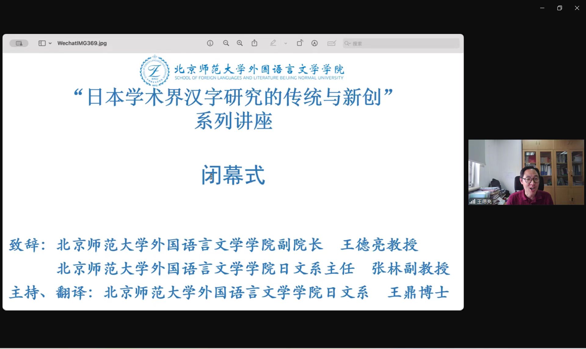 正如王德亮副院长在致辞中所说,国内举办日本汉字研究专题并云集日本学术界一流学者的系列讲座当属首次,这是我院日文系、日语教育教学研究所本年度的一项重要学术活动,同时彰显我院拥有一流的国际学术资源和高水品交流平台,相信每一位参会者都不同程度地获取了新知卓见。致辞最后,王德亮副院长还盛赞日文系令狐菁菁、杨蕊、石泽玮、毛彩丽、刘禹辰、郭宏福和周玥彤等同学为讲座付出的努力。