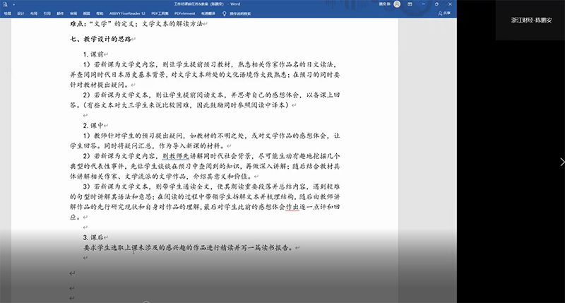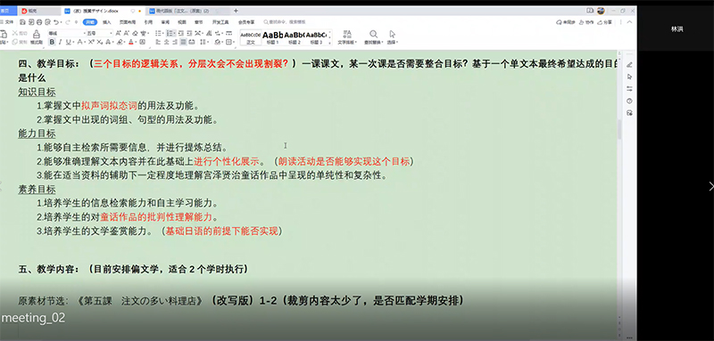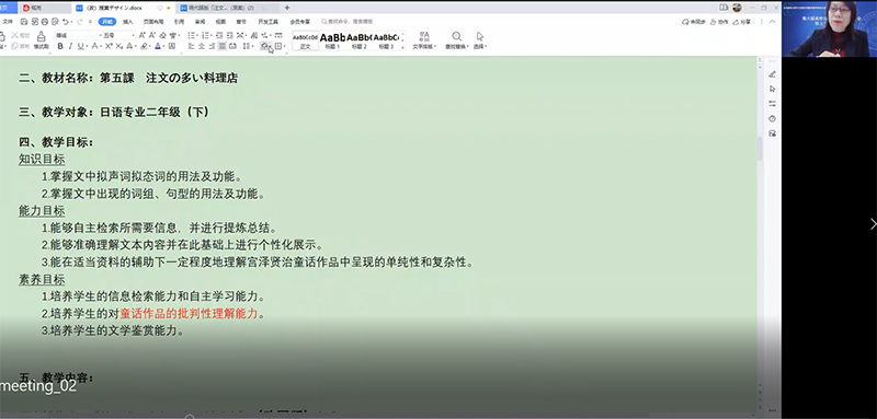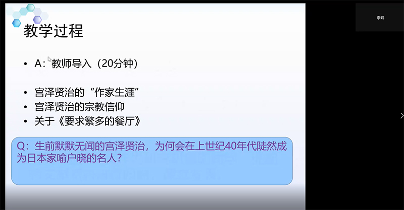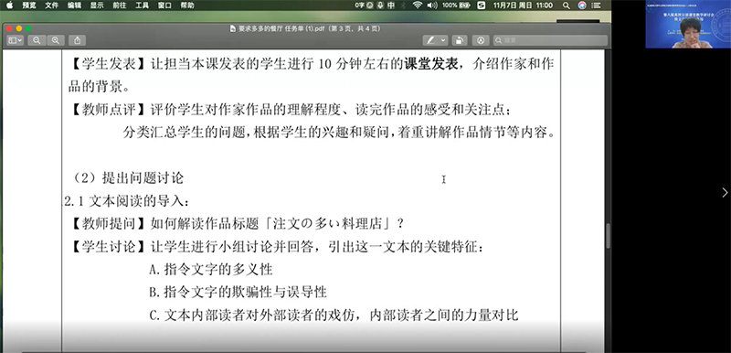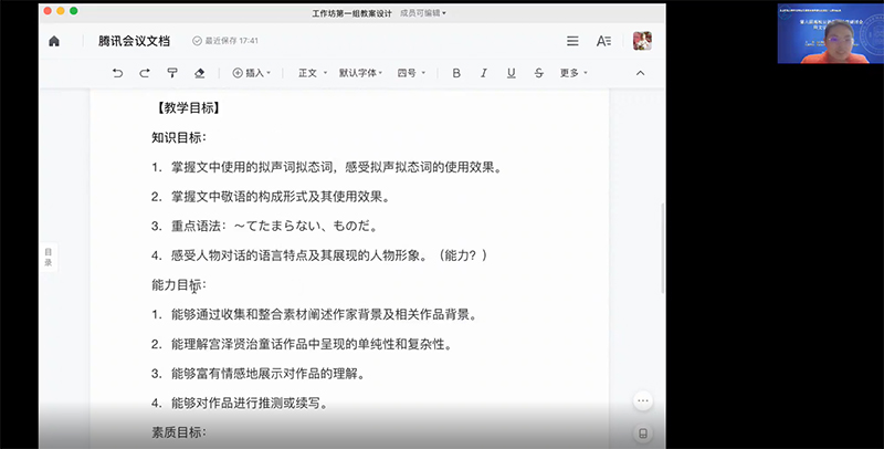 7日上午9时,大会进入工作坊成果发布的阶段。参加工作坊的三个组老师均选派一名成员,在线汇报本组所设计的教学方案。首先介绍本组所归纳的需要改进的问题以及改进的策略,随后具体介绍教案的内容,主要包括:课程名称、教学对象、教学目标、教学内容、课时安排、教学过程、教学方法、评价方法等。每个组汇报展示之后,coco漫画 日文系的王志松老师、林涛老师、冷丽敏老师、林洪老师依次点评。点评的要点涉及文本的处理、切入点的确定、教学目标的合理性及可操作性、教学流程的逻辑性、教学目标与评价的关系等环节。
