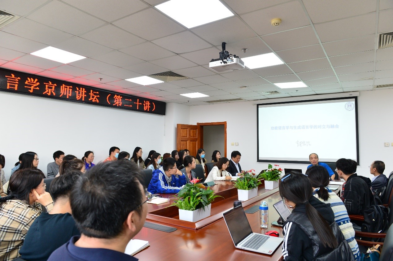 本次讲座的主题是“功能语言学与生成语言学的对立与融合”。封教授结合自身理论研究以及求学经历对两大语言学流派间的沟通对话进行了细致且深入的探讨。首先,封教授讨论了形式主义和功能主义的对立和互补,指出两个流派并不针锋相对,然而两个学派之间的交流相对欠缺。Halliday在诸多文献中对Chomsky的研究给予高度评价,而Newmeyer是生成学派中为数不多关注和评价功能语法的学者,且并未涉及Halliday系统功能语法。而后,封教授讨论Halliday思想中的“生成立场”和Chomsky思想中的“功能立场”,进一步佐证两个流派之间存在交织与融合。