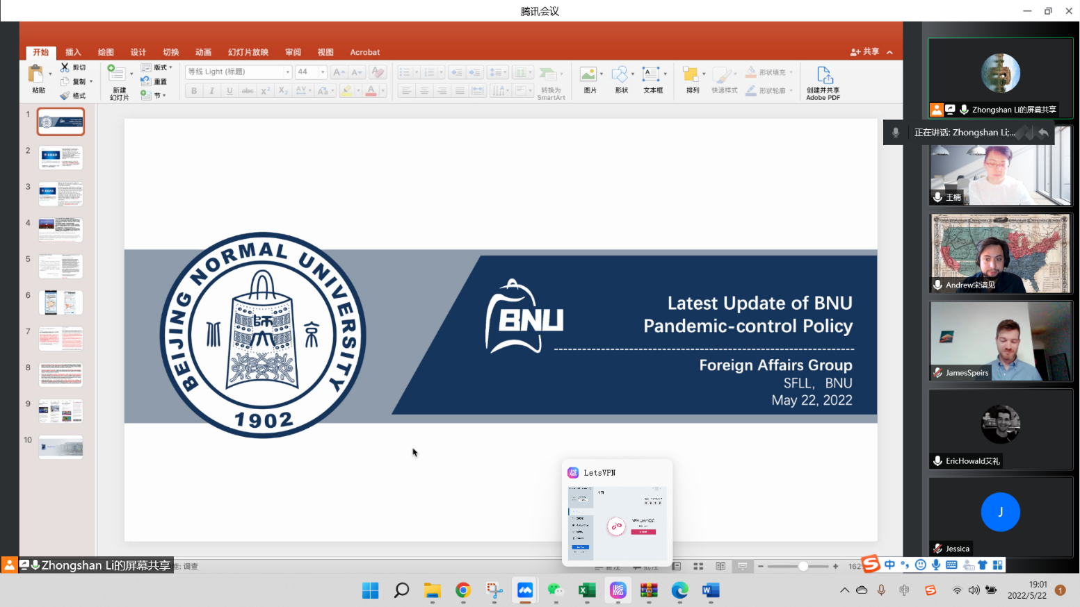 2022年5月22日,coco漫画 外事团队召开了学院外籍教师疫情防控宣传教育和服务工作线上会议。副院长王楠老师、外事主任李中山老师、外事秘书刘冉老师及学院全体外籍教师参加了此次线上会议。