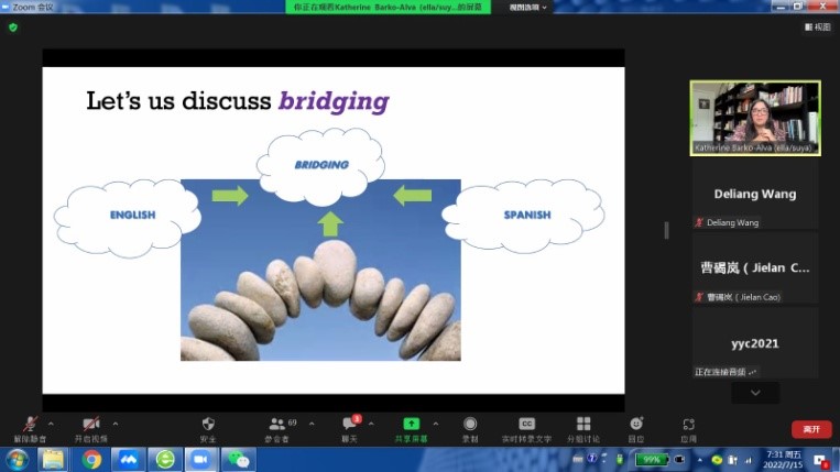 本学堂持续了四天,每天两场讲座,来自北师大和威玛的七位老师分享了他们最新的研究成果。威玛的黄婷老师讲解了线上教学及文化回应教学,还介绍了一项为期两年的定性多案例研究,重点聚焦于视频学习和学习者主体性;Robert Oliver介绍了威玛的ESL项目及其相关从业经验;Katherine Barko-Alva介绍了美国的双语教育情况。北师大的孙晓慧老师讲解了如何在“生态视角下以课例研究促进外语教师学习”;陈则航老师介绍了批判性思维的表现及其培养方法;林敦来老师为大家介绍了中国教育质量国家评估(NAEQ)的相关情况;王德亮老师讲解了如何“在课堂上基于对话句法与学生互动和共鸣”。