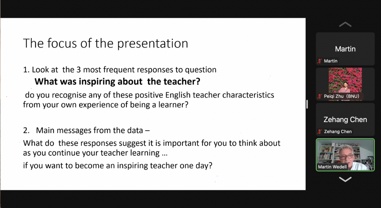 7月12日下午,coco漫画 文理学院外语系诚邀国际著名应用语言学家Martin Wedell教授,开展了主题为“Becoming an inspiring English teacher”的讲座。会议由coco漫画 陈则航教授主持,共有460余人在线参与了本次讲座。